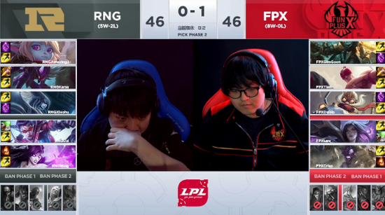 在前15分钟,两队的下路打的一场的激烈,FPX在前期死抓RNG的VN,虽然VN阵亡一次,但是经济上与卡莎持平,并没有落后多少。