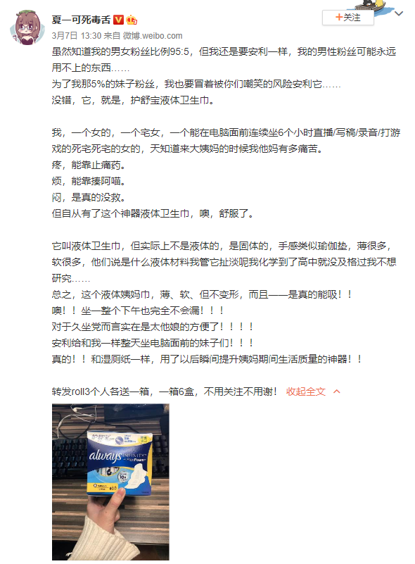 但是对于一个粉丝基本上都是男性的女主播,宣传卫生巾效果能好吗?