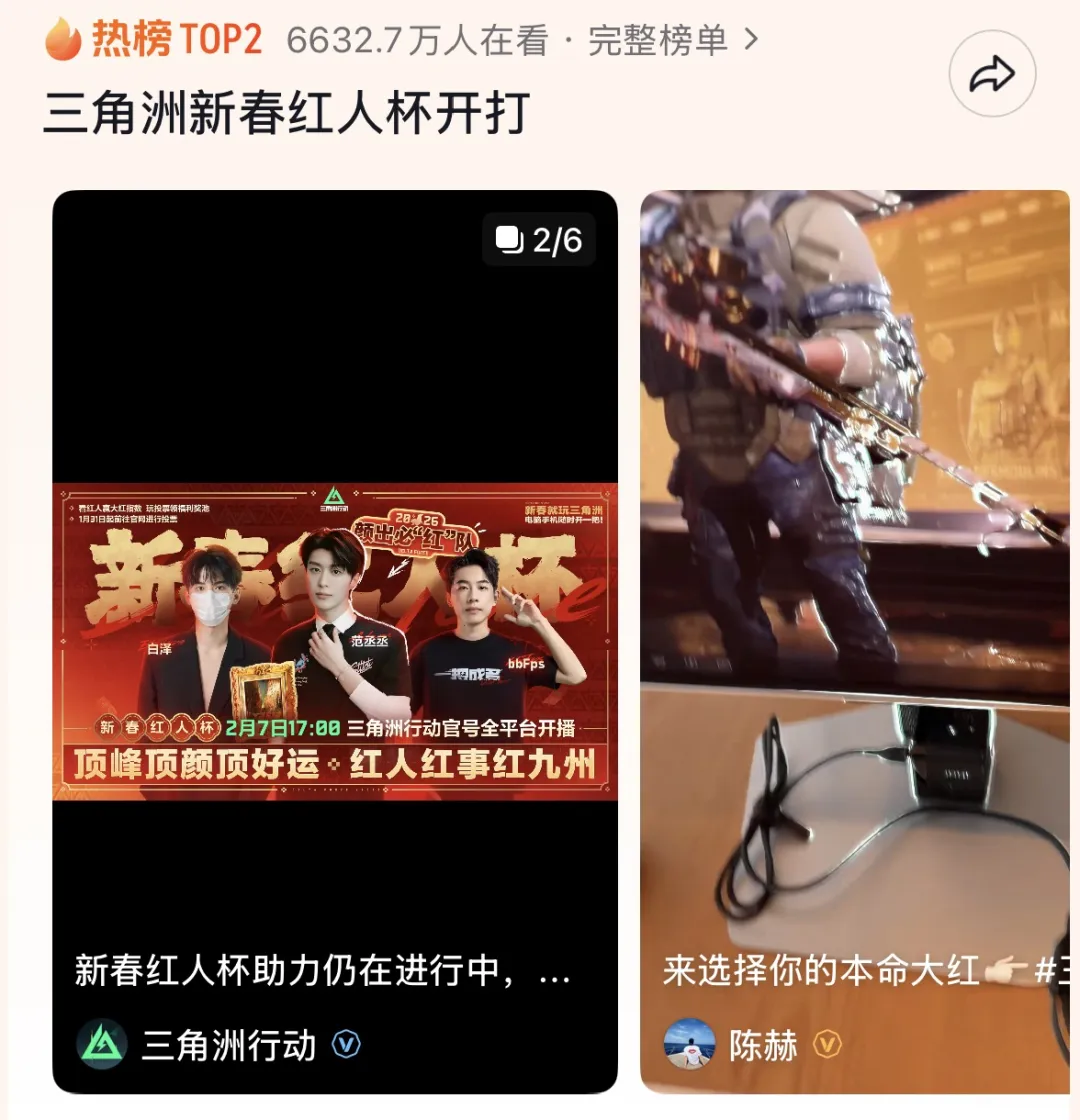 这股影响力还被进一步放大,在2月7日官方举办的新春红人杯上,陈赫、范丞丞、王勉、胡夏、彭昱畅、柯洁等跨界明星和游戏主播同台竞技,它的势能直接让相关话题登上了抖音热榜Top 2,不少主播的直播间同时在线人数都冲上了10万+,吸引了越来越多玩家入坑三角洲, 甚至不少是女性用户。