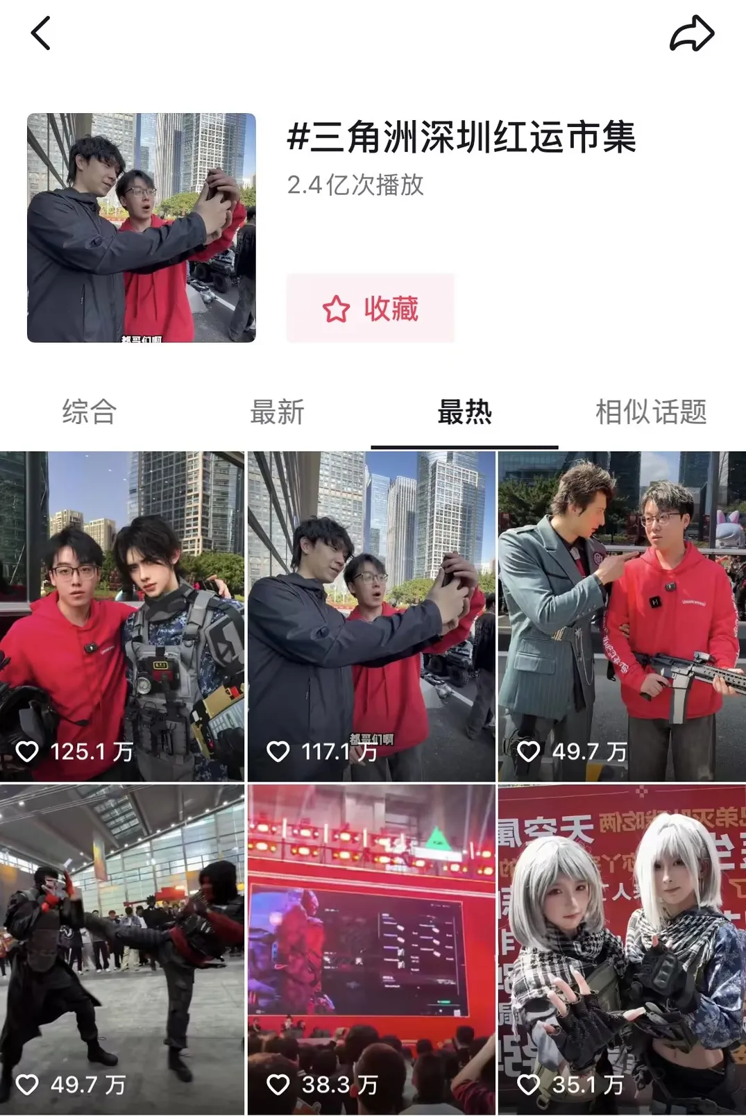 类似的场景还有很多,比如他们在福田会展中心办春节红运市集,撬动了2.2万人前来线下参与,全网视频播放破2.8亿次,两次登上抖音热榜。