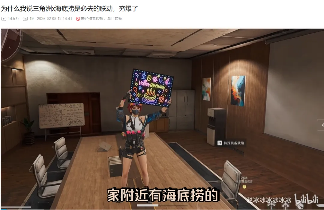 (场面一度混乱) 也就是说,搜打撤赛事在不同的赛制安排下,完全是不同的画风,比起一般纯竞技的比赛更有乐子。而这些有趣的切片,又能起到更好的内容传播、破圈效果。 当然,《三角洲行动》的新春红人杯能成立,能让明星和主播一同贡献“电子春晚”,还是有很多别人难以复制的基础条件。比如游戏本身的用户基数足够大,知名度高,玩法扩展性强。 当具备了这些条件后,新春红人杯就不再是游戏官方单方面的流量索取了,而是多方共赢。明星、主播能从这场红人杯中扩大影响力,辐射更多玩家;各个直播平台也能通过这场比赛收获更多流量,打造话题和活动案例。在这种情况下,红人杯具备高额流量,也就不奇怪了。 最后,与线上宣发同步推进的,还有线下的多场景覆盖。 春节期间,《三角洲行动》和海底捞展开了“海底捞大红”联动。 此前,社区里就有过不少玩家玩梗,将海底捞经典的四宫格比作航天基地的核心区地图,常常对着火锅指点江山。