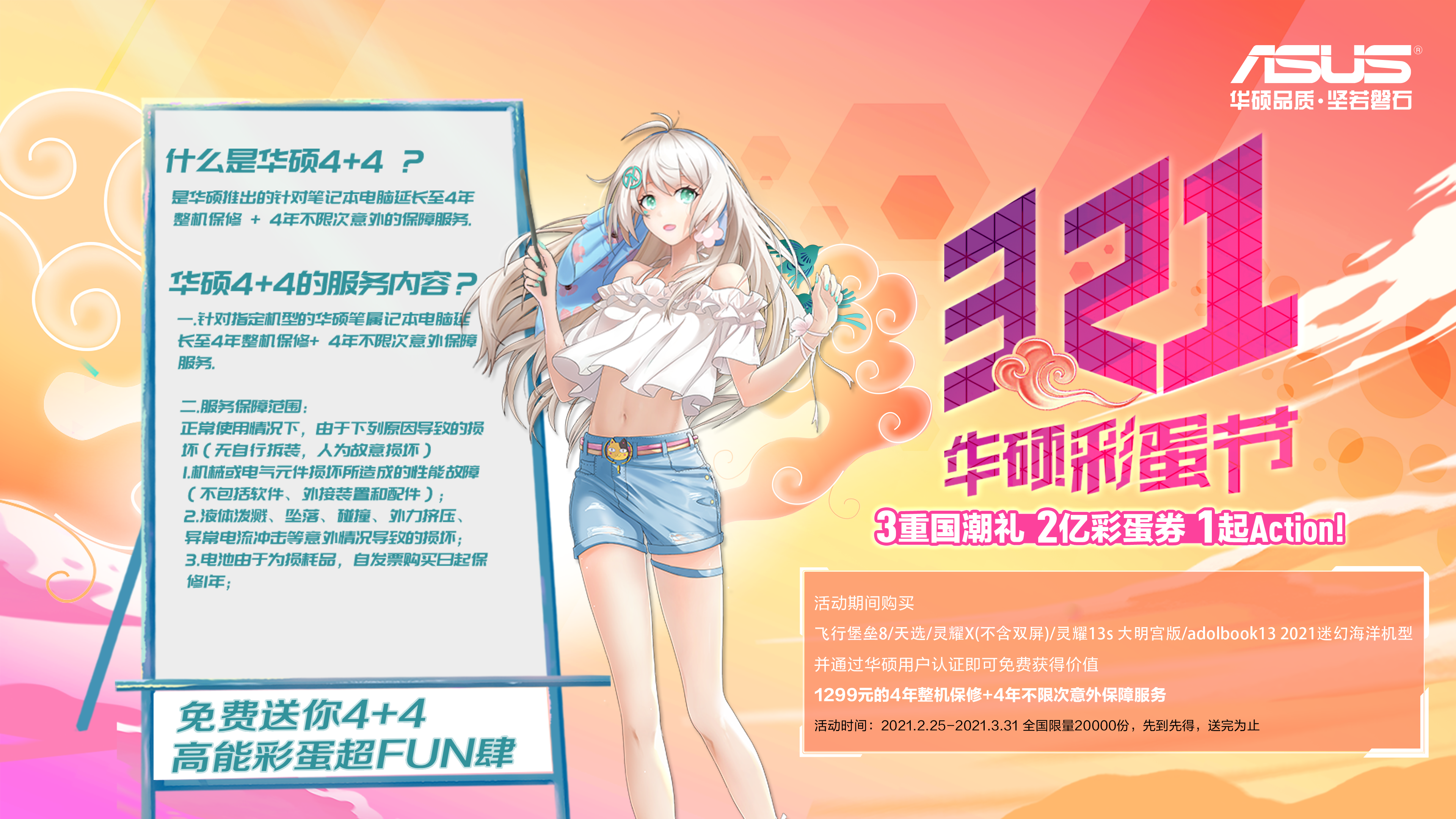 来到实体店,华硕321彩蛋节带你发现买电脑的正确姿势!2021年2月25日至2021年3月31日,来华硕线下门店购买指定机型即可免费获得(对没错,就是白嫖!)价值1299元的4+4无忧保服务礼一份,给你的“好机友”叠加一个长达4年的“整机保修服务+不限次意外保障服务”增益buff。从此不仅告别保外斥巨资维修与挥泪贱卖的“绝望二选一”,出现液体泼溅坠落挤压电流冲击等意外情况也能享受保修,让你的电脑直呼“爷青回”!