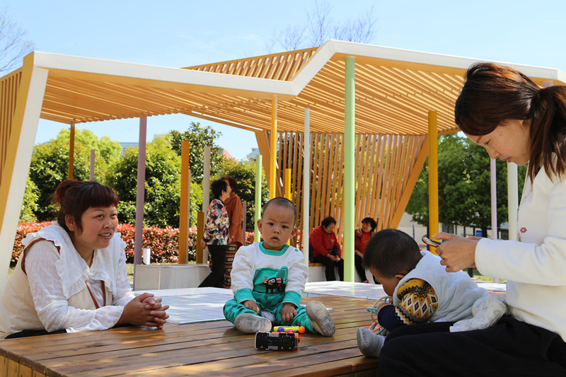 永翔佳苑是一个以高层建筑为主的农民动迁小区, 2、3号楼之间的公共场地是老人与小孩的主要休闲活动场所,但由于场地内没有设置休闲座椅及遮阳设施,居民大多无法聚集活动,针对居民的需求,微更新中将两组现代凉亭放入公共区域,花坛周围放置了大小、材质不一的几何形座椅,满足了社区内不同类型居民在不同时段、不同空间层次的公共活动需求,这一微更新不仅在永翔社区形成了“熟人社区”,而且这里还成了大家争相拍照的“网红”景点。“谁说我们动迁小区不洋气啦,我们也是网红呢,欢迎来拍照打卡。”热情的居民自豪地说。