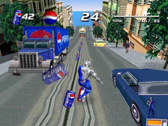 游戏植入广告(In-Game Ads)大致可以分为三种类型,即静态广告、动态广告和广告游戏。 静态广告一旦植入就无法更换,适用于大部分无需联网的单机游戏。如果是网络游戏的话则以动态广告居多,让广告主通过CPM等方式竞价排名,获得曝光。 而广告游戏就完全是另一码事了,你可以理解为是游戏开发商为广告主私人订制了一款游戏,目的就是为了推广其品牌或者产品。1999年,饮料业巨头百事可乐就曾经在PlayStation上推出过一款名为“百事超人”(Pepsiman)的跑酷类游戏,玩家操控一位身穿蓝白紧身衣的肌肉猛男在街道上奔走,同时收集散落在路面上的可乐罐头以补充活力。