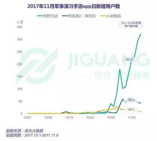 在刚刚过去的半个多月里,抢占中国网民时间和流量最多的,除了日渐式微的双十一,就属最近集中上架的几款国产大逃杀类手游了。据极光大数据统计,截止11月8日网易出品的《荒野行动》和《终结者2:审判日》DAU分别为1014万和370万,小米旗下的《小米枪战》是175.5万,而腾讯系的《光荣使命:使命行动》和其他中小开发商的竞品还在加入战局的路上。大胆预测到明年Q1为止,吃鸡类手游在全球范围内都将保持高速增长的趋势。